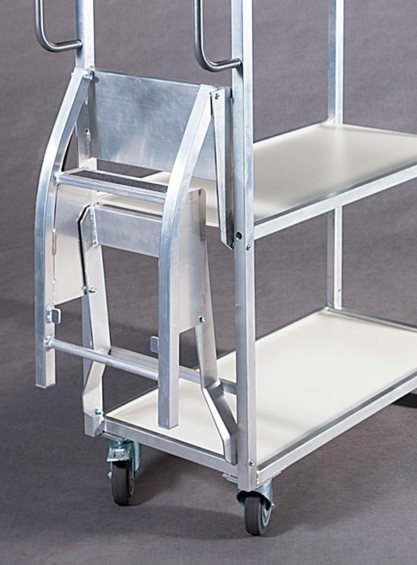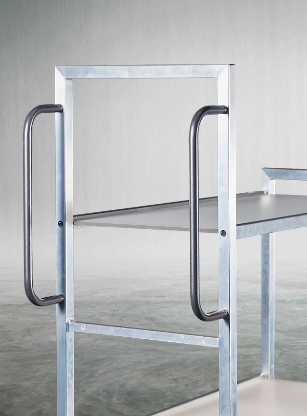 Der Grundrahmenl besteht aus quadratischen Aluminiumprofilen mit 3 vertieften Ebenen (Ausfallschutz) aus weiß beschichteten Böden. Standardgriffe und 3-stufige, anklappbare Treppe.